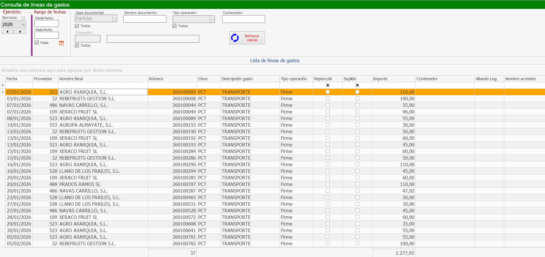 Cuando abrimos el componente consulta de gastos lo primero que veremos sera un listado de gastos el cual podremos consultar aplicando distintos filtros como: fechas, clase documental, proveedor, tp de operación …