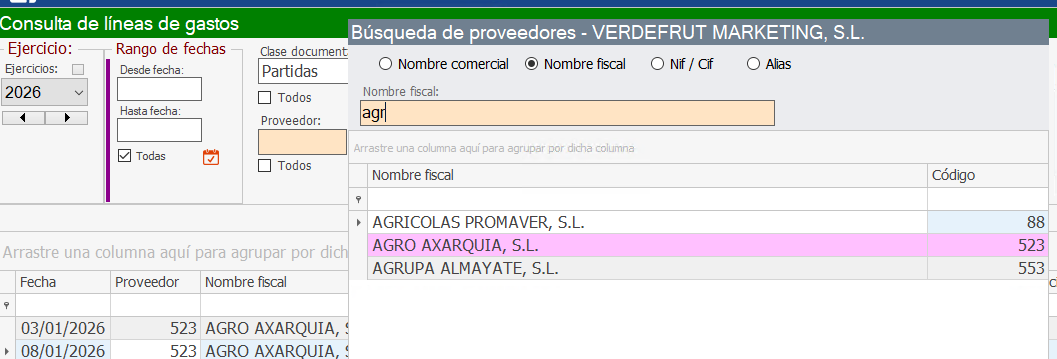 Para buscar un gasto de un proveedor especifico completaremos el campo proveedor