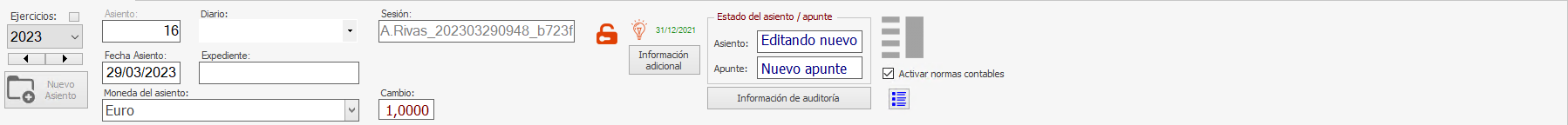 En la cabecera es importante que indiquemos la fecha del asiento que vamos a introducir. Una vez hecho esto, empezamos a introducir los apuntes del asiento.