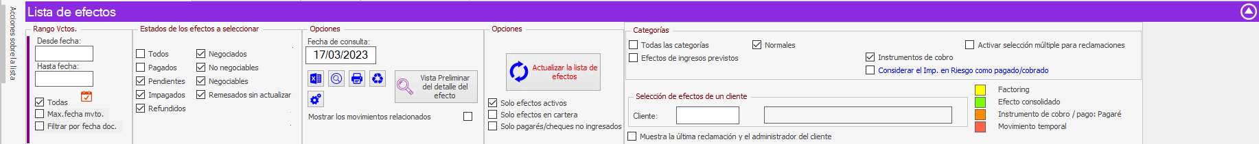 Podemos indicar un rango de vencimientos de efectos, los estados de los efectos, la categoría de los efectos o filtrar por cliente.
