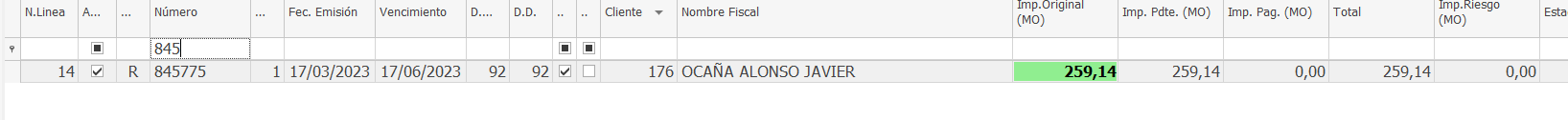 En este caso la lista muestra todos los efectos pendientes de cobro, indicándonos información relacionada con el efecto como el número de documento (factura de cliente), la fecha de emisión, la fecha de vencimiento (esta se calcula en función de la forma de pago asociada al documento), la diferencia de días entre la fecha de emisión y la fecha de vencimiento, los días pasados desde la fecha de vencimiento, el código y el nombre del cliente asociado al efecto, el importe original, el importe pagado, el importe pendiente del efecto, el importe en riesgo y el estado interno del efecto.