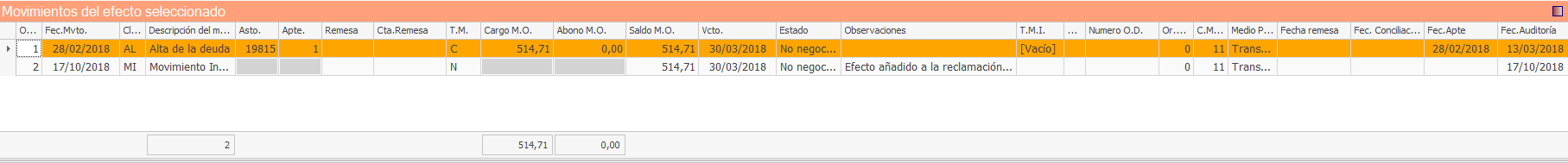 Cada efecto tiene asociado un histórico de movimientos, en el que nos muestra todas las acciones sobre el efecto de forma cronológica. Si seleccionamos en la lista un efecto, en la parte inferior de la pantalla nos mostrará su histórico asociado.
