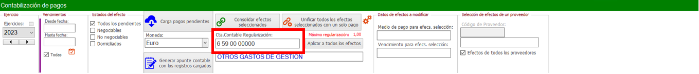 En ese recuadro le indicas la cuenta de regularización donde tiene que llevar la diferencia entre el importe de la factura y el importe pagado. Y mediante el botón situado justo a la derecha de ese recuadro, aplicaremos esa cuenta de regularización a todos los pagos con diferencias.