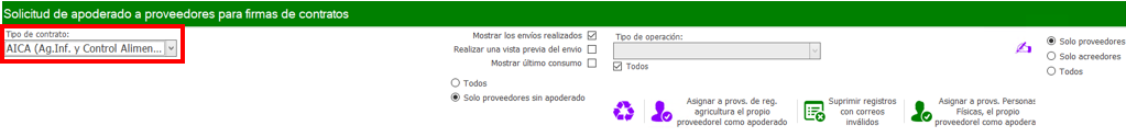 Por un lado, podemos asignar al proveedor que este incluido en el registro de agricultura como apoderado mediante este botón.