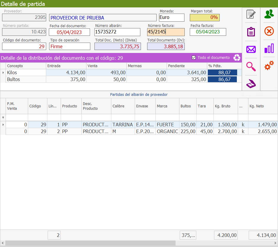 En este detalle del albarán podemos observar una cabecera con los datos de la entrada.