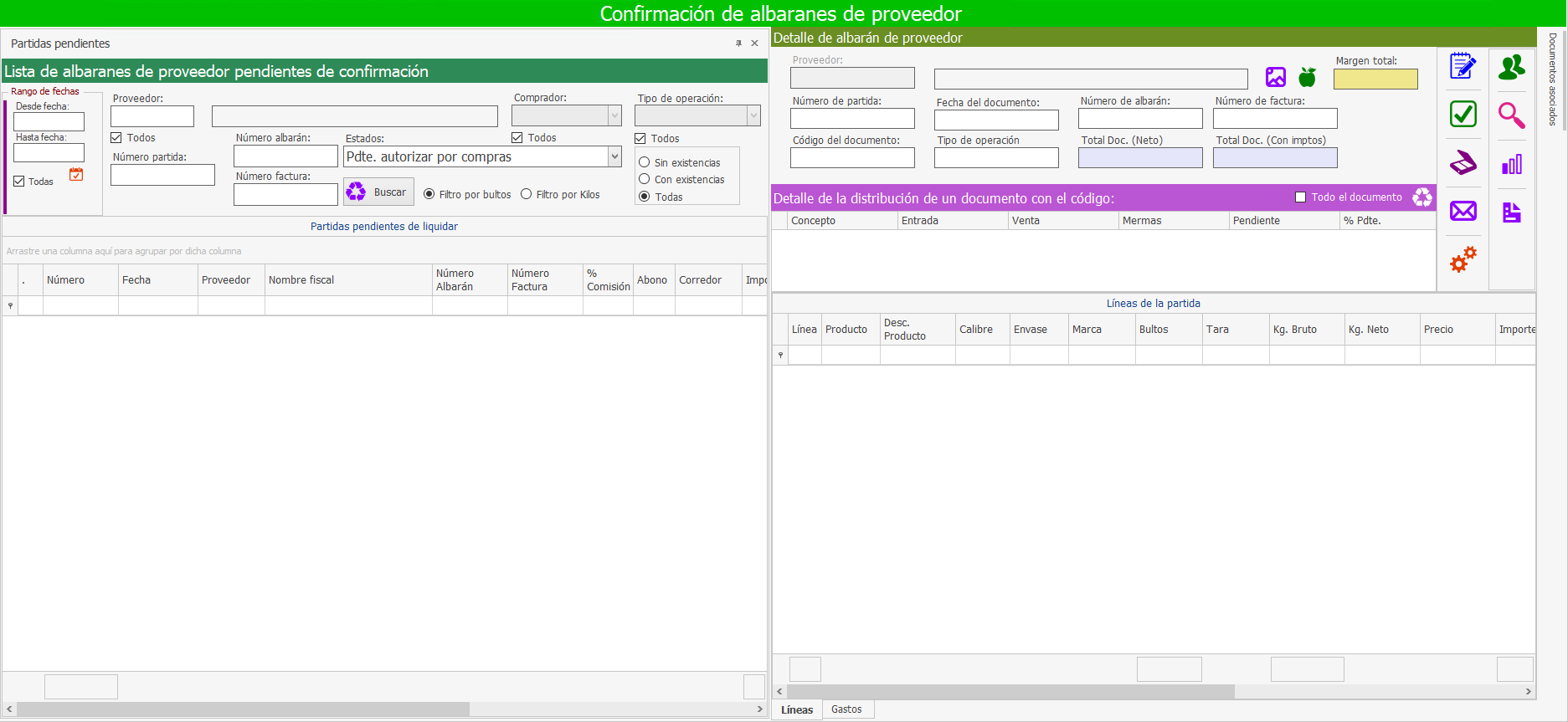 El apartado de confirmaciones tiene dos ventanas. En la parte izquierda cargaremos la lista de albaranes de proveedor pendientes de confirmar.