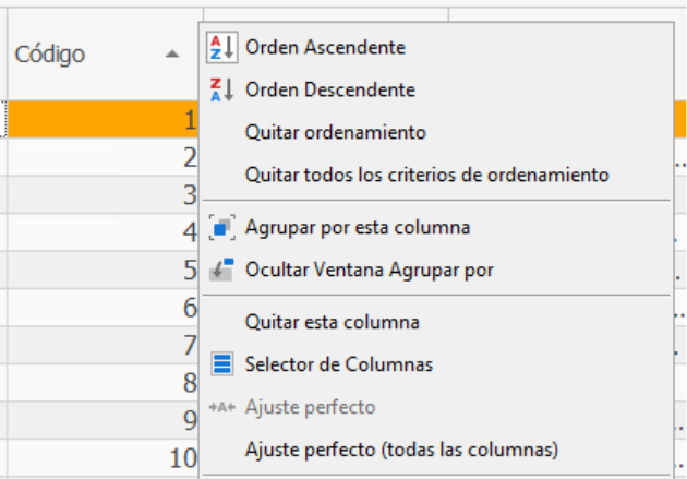 Además del menú contextual que hemos indicado, podemos tener otro menú contextual que sale al activarlo desde las cabeceras de la lista: