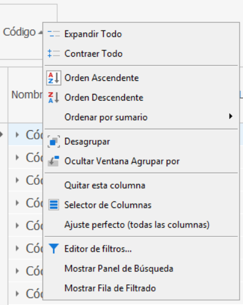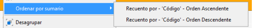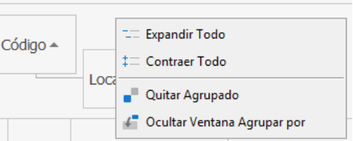 Haciendo clic derecho en la cabecera de la agrupación podremos: Expandir. Contraer, quitar agrupador y Ocultar ventana de agrupado