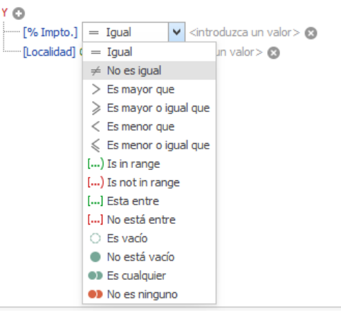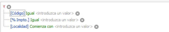Para ello podremos añadir cuantas columnas queramos en nuestro filtrado: código, localidad, % de impuesto para ello pincharemos el botón + al lado de Y,